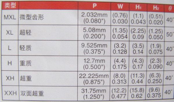 | MXL (橡胶) | 2.032mm (0.80") | 44、45、48、50、52、53、54、55、56、57、59、60、61、62、63、64、65、 |